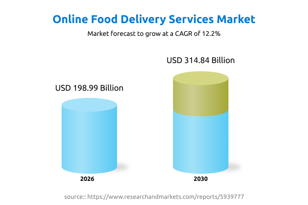 The online food delivery services market is projected to reach US$198.99 billion in 2026, growing from US$177.9 billion in 2025 at a CAGR of 11.9%. This growth reflects strong consumer demand for convenience, digital adoption, and the continued expansion of delivery ecosystems.